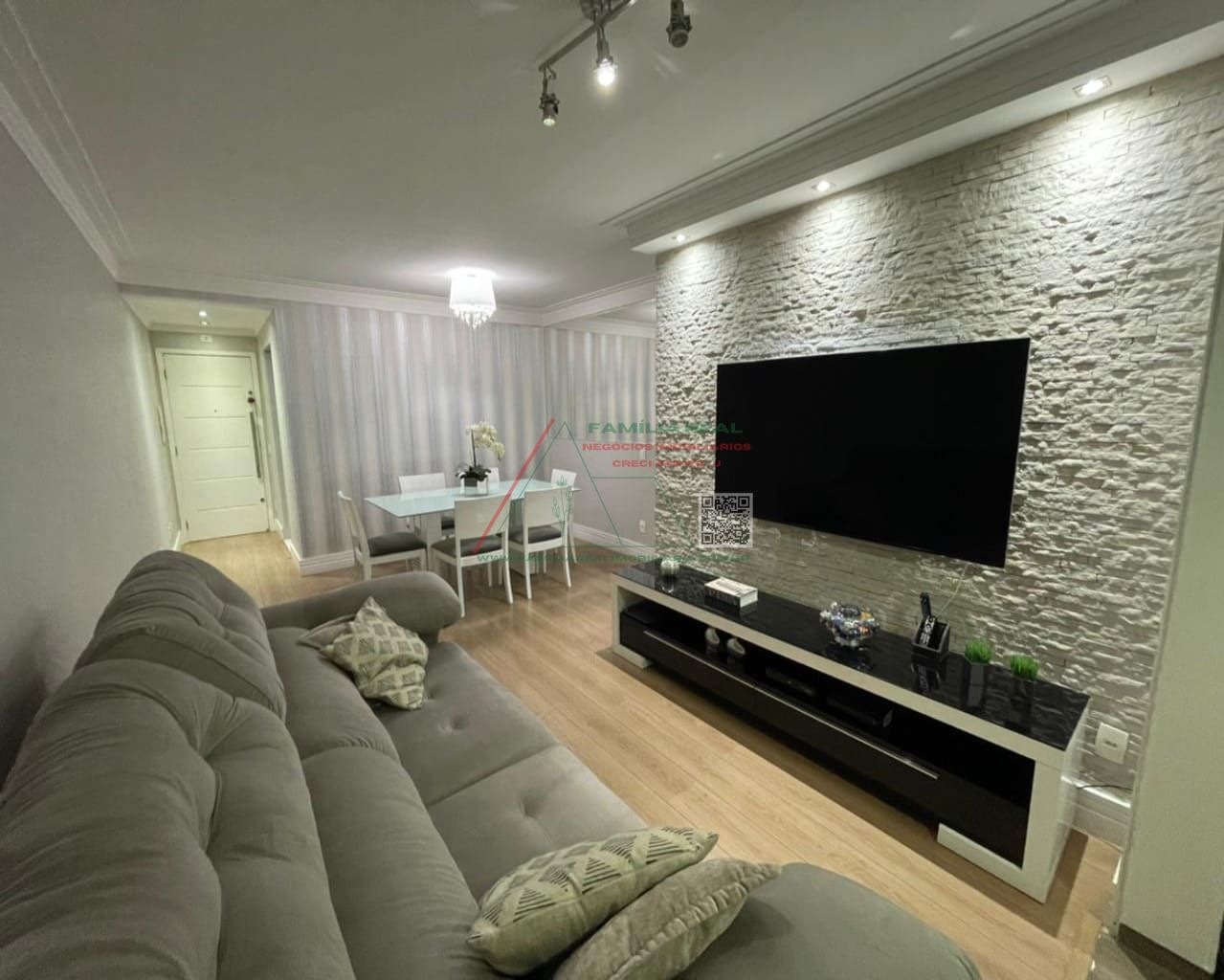01 Sala de estar e jantar, estendida com a sacada envidraçada e espaço para uma churrasqueira grill