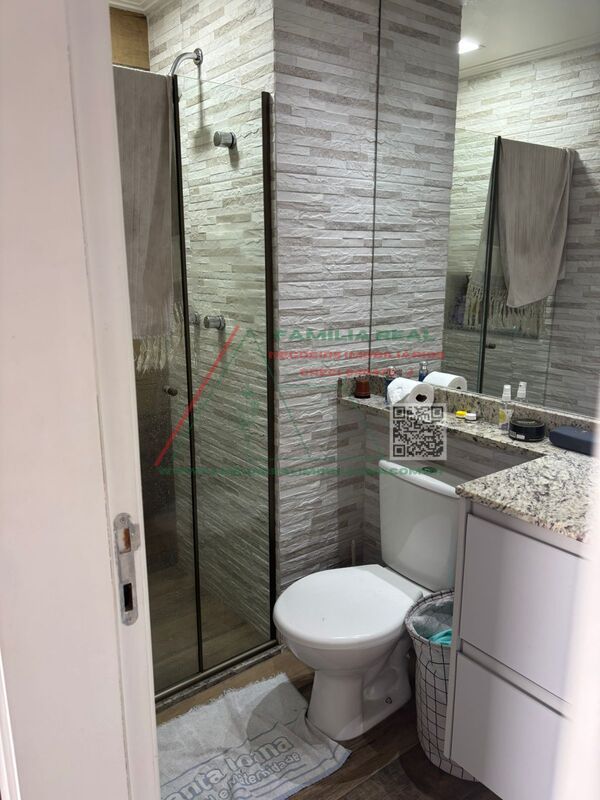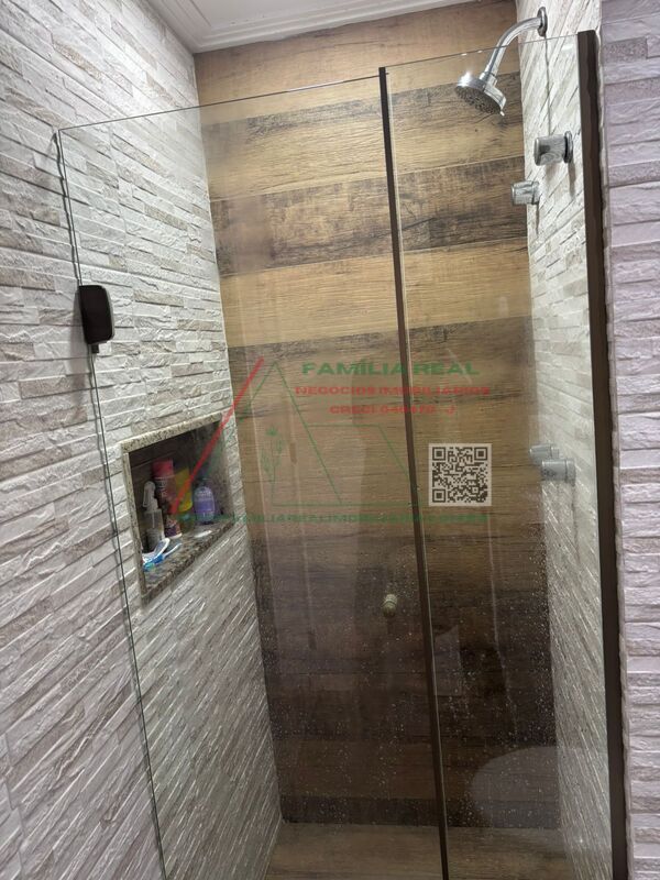 01 Banheiro Social, com box de vidro, gabinete com bancada estendida e espelho na parede